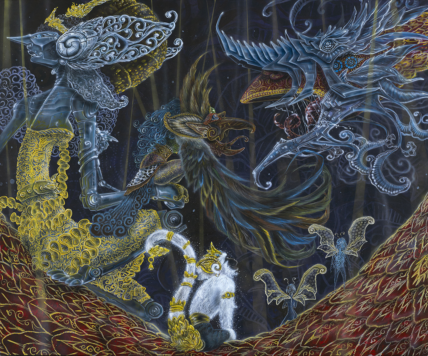 Daud Rahim, known for his stunning drawing talents, also turns to ideas of spirituality. Often he mixes these with ultra-modern or macabre images, engaging the curiosities of his contemporary viewer. His skill is easily demonstrated in his use of deceptively difficult ‘reverse-technique’ colour styles, where he primes his canvas black then works with a myriad of colours to add light, tone and life. Audiences today enjoy visuals in which all is not as it seems, and this characteristic is employed in another manner by the expansive and humorous painter Ali Nurazmal. Comprehending the classical tenants of painting as developed by Renaissance artists, Ali updates the style by depicting scenes of modernity. His perfectly rendered canvases, bursting forth with wit, sarcasm and personality, are as charming as the artist himself.
