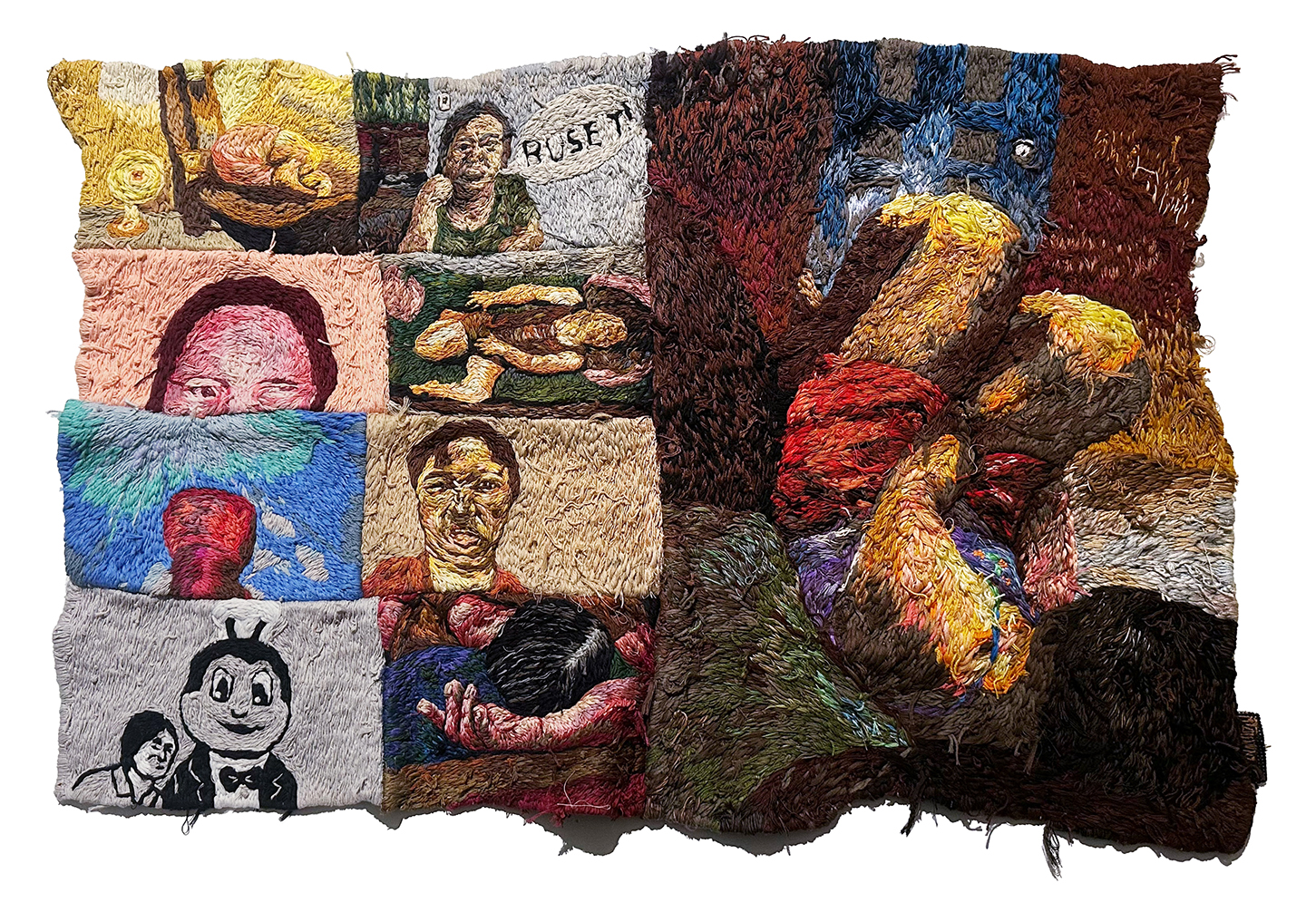 The work Inako (2018) is an embroidered portrait of her mother, created from memory and everyday observation. “Inako” holds dual meaning—both “my mother” and “I took responsibility”—speaking to her mother’s silent labor and resilience within the family. Through a patchwork of intimate vignettes, stitched with bold texture and color, Tolentino honors maternal care while acknowledging the emotional and physical weight it carries. The piece reflects her broader practice: a feminist reclamation of thread as both material and metaphor for strength, love, and lived experience.