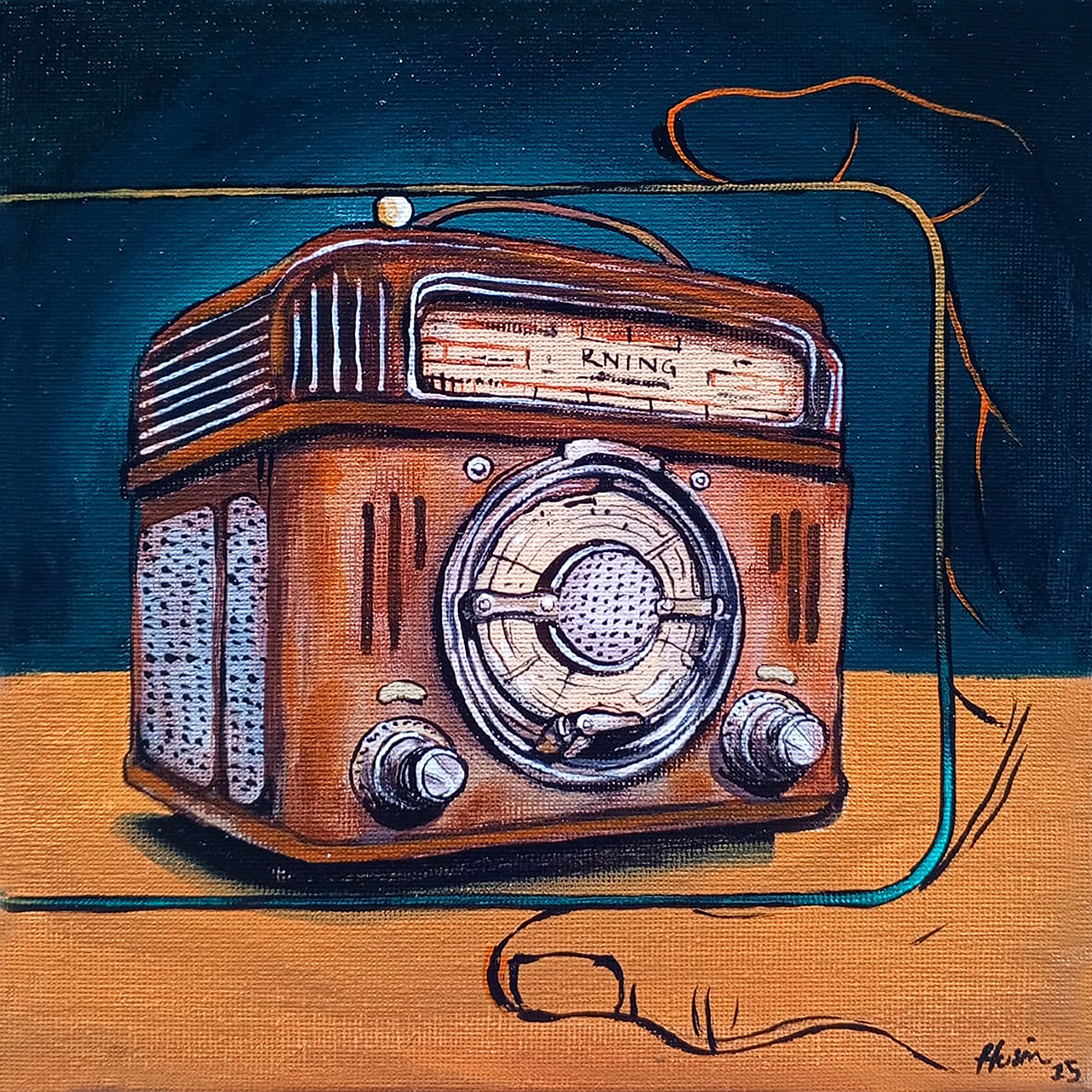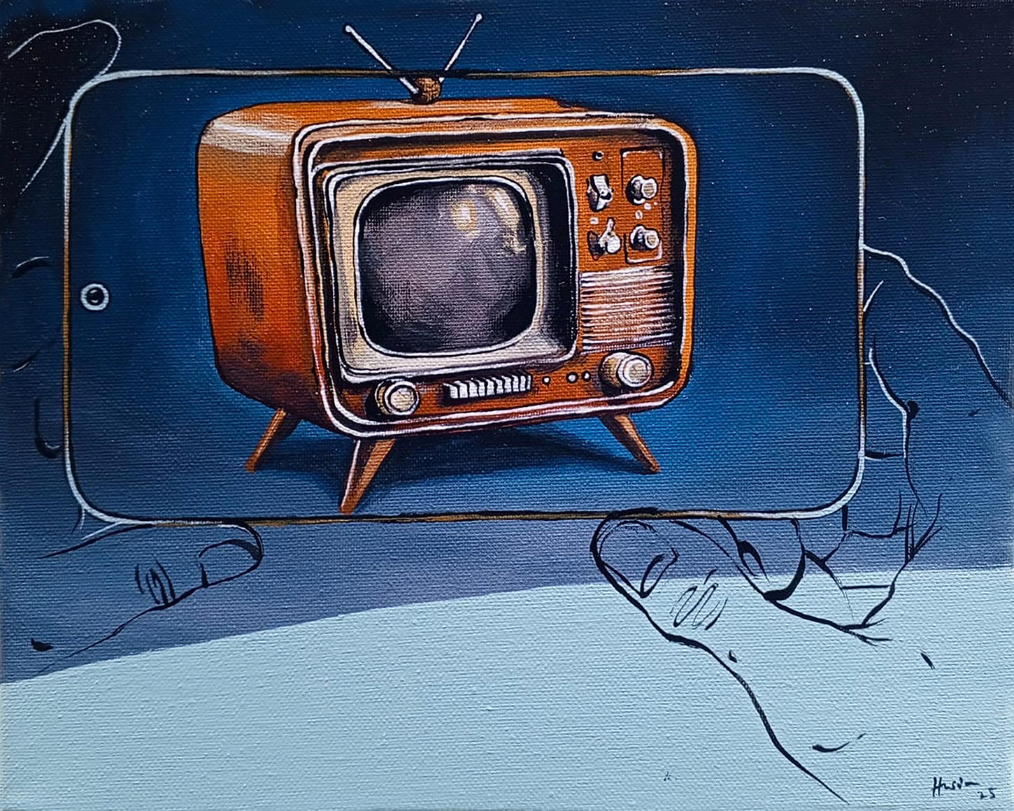 This artwork serves as a frame of memory, capturing a place that was once part of the artist’s life. It reflects a past that still breathes in memory—every street corner, every worn-out alley, every space once filled with voices and stories. Though the physical location may have faded with time, the work presents it in two contrasting dimensions: a decaying reality and a digitally enhanced version, shaped by idealized memory. The piece evokes nostalgia, perhaps of childhood moments or unnoticed beauty, now reimagined through the lens of technology. It portrays the irony of modern life, where a small screen can transform perception—hiding flaws and crafting beauty that never truly existed. On one side, the real world appears dark and disordered—crowded markets, silent rusty streets, and abandoned playgrounds rendered in muted tones and harsh lines. Yet within the screen, everything is vibrant, orderly, and idealized, suggesting how digital aesthetics can mask reality and reshape how we remember the past.