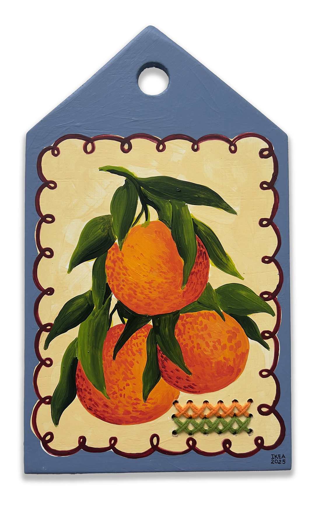 “Prosperity Magnet” is a hand-embroidered and acrylic painting on wood that captures Rizalon’s signature approach: playful yet reflective, intimate yet expansive. Depicting a cluster of ripe oranges framed in scalloped borders, the work evokes themes of abundance, heritage, and domestic ritual. A stitched detail at the bottom right—crossed threads in green and orange—adds tactile dimension, symbolizing care, labor, and quiet prosperity. Through this charming yet layered work, Rizalon repositions everyday imagery as a portal into shared cultural memory and emotional depth.