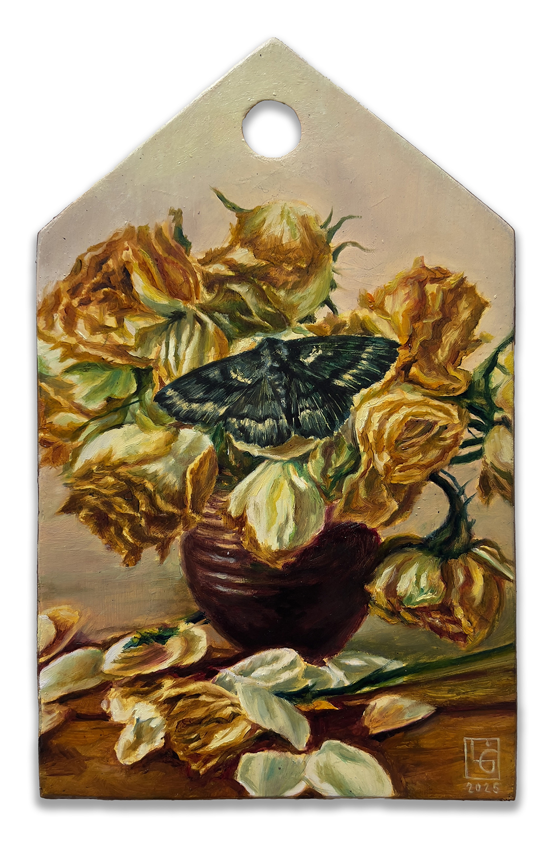 In Gunita I (2025), Gomez paints a bouquet of withering yellow roses accompanied by a dark moth, laid upon a wooden surface, rendered on a house-shaped wood panel. The piece symbolizes memory (“gunita” in Filipino) as something both delicate and haunting—ephemeral like the petals, yet enduring like the dark-winged observer. The contrast between decay and quiet elegance reveals a meditation on loss and remembrance. Through this, Gomez captures not just what is seen, but what is felt and remembered. His works stand as contemplative spaces—where personal and collective histories converge in painterly silence.