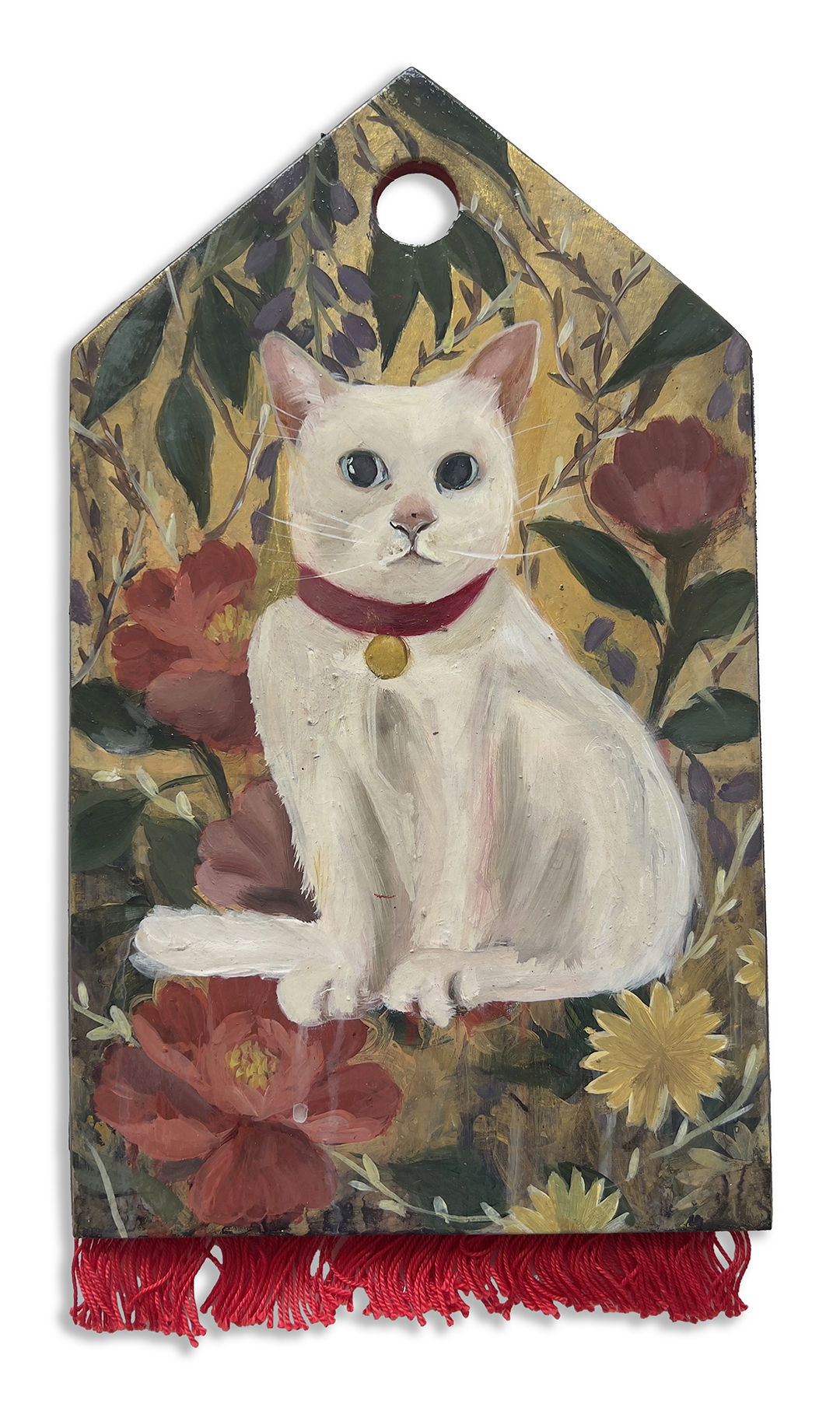 這幅作品中的白貓,身披紅色項圈與金鈴鐺,靜坐於花葉繁茂的背景之中,彷彿化身為家宅的守護靈。自古以來,貓在世界各地的文化中皆被視為能驅邪避凶、招福納祥的靈獸,不僅擁有靈敏的感知力,也象徵獨立與溫柔的力量。畫中的白貓凝視前方,目光安定而堅定,其姿態如同沉靜的守門人,在無聲中守護著居所與心靈的平安。紅鈴與金飾不僅增添畫面視覺重點,更象徵幸福的召喚與內在能量的流動。此作融合了民間信仰與當代情感,將日常中的守護意象昇華為富含寓意的文化符號,傳達出一種柔中帶剛、靜中藏力的情感共鳴。