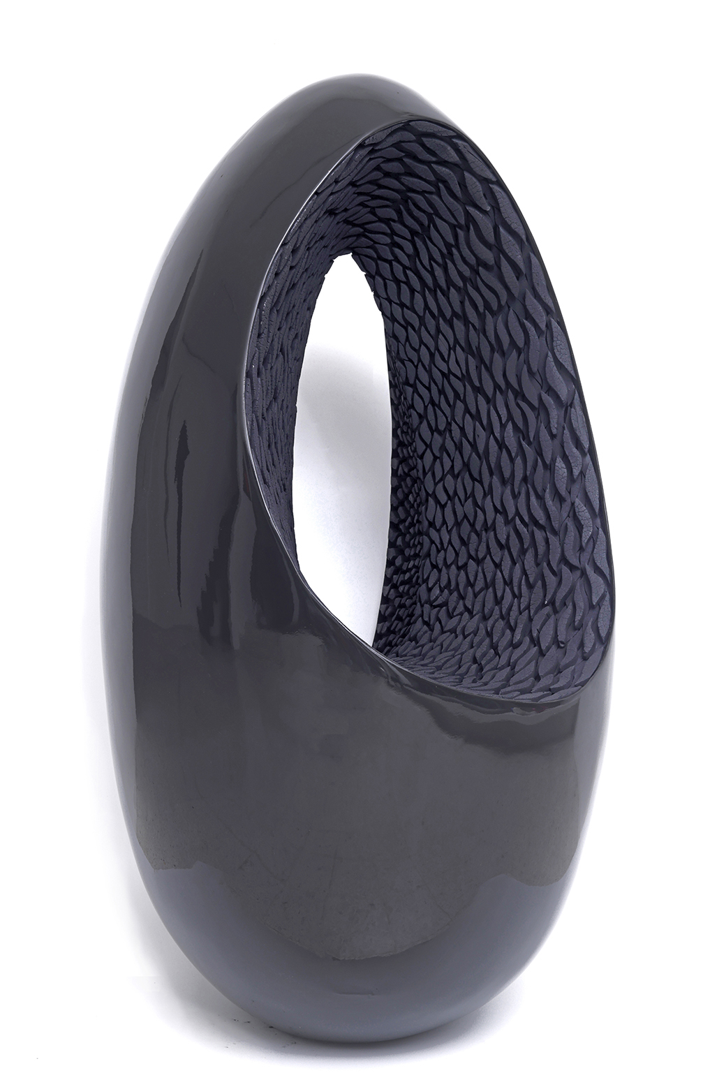 Po Oi Circle within A Circle – Black is the Stability of Elegance Fibreglass, 2K Autopaint and Assemblage of Small Patterned Burnt Wood Cut Relief 122cm (H) x 61cm (W) x 61cm (D) 2024 (front)