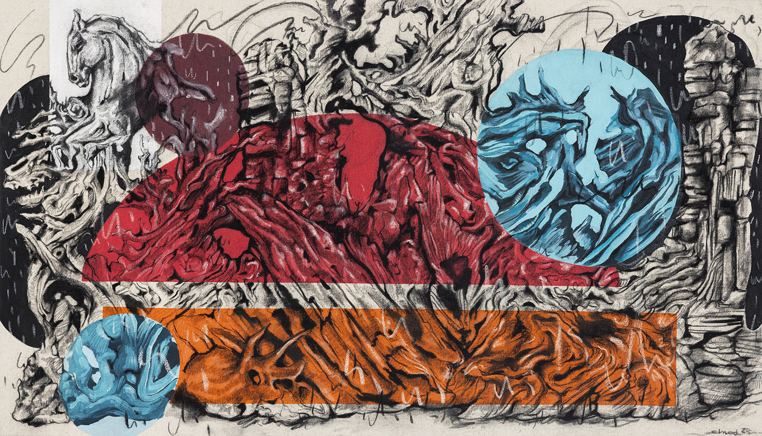 Fadzril’s practice is rooted in mixed media, where layers of canvas, paint, print, and oil pastel converge. Drawing inspiration from Malaysian batik motifs and the natural environment, he constructs semi-abstract landscapes that oscillate between memory, culture, and imagination. Sunflowers and roses frequently emerge as symbolic forms, representing life’s dualities—growth and decay, harmony and disruption—while his vibrant palettes and layered brushwork echo the spirit of Fauvism, infused with a local sensibility.