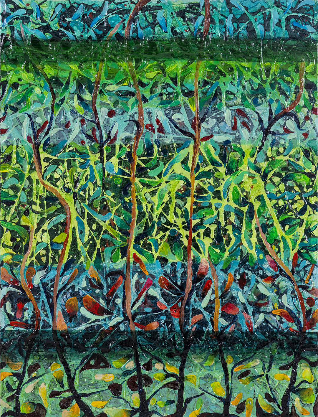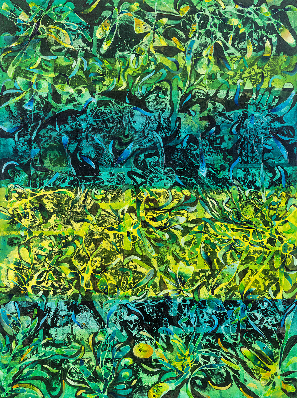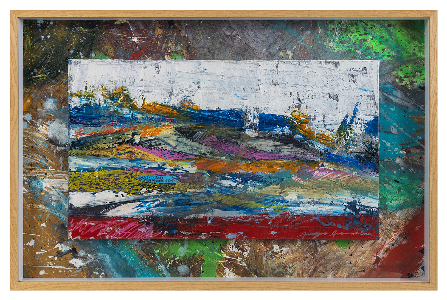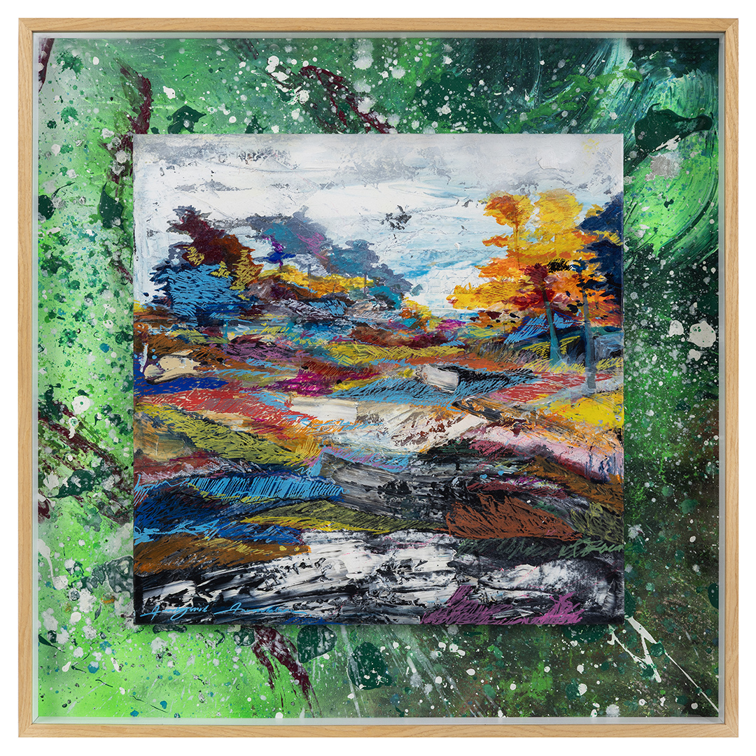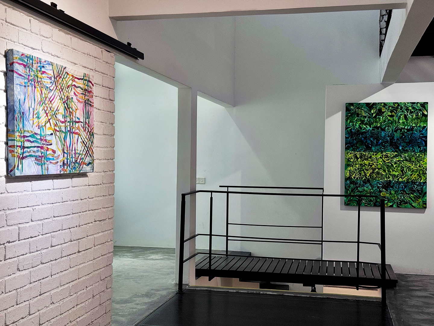 In his latest series, Fadzril explores the notion of the “mindscape,” transforming jungle visuals, flora, and organic patterns into abstract compositions. Beginning with soft monochromes and developing through splashes, strokes, and translucent layering, his works unfold as endless proliferations of light and form. This process embodies both personal reflection and cultural resonance, positioning nature as therapeutic, symbolic, and deeply tied to identity. Through these explorations, his art communicates narratives of love, memory, and renewal within the contemporary Malaysian context.