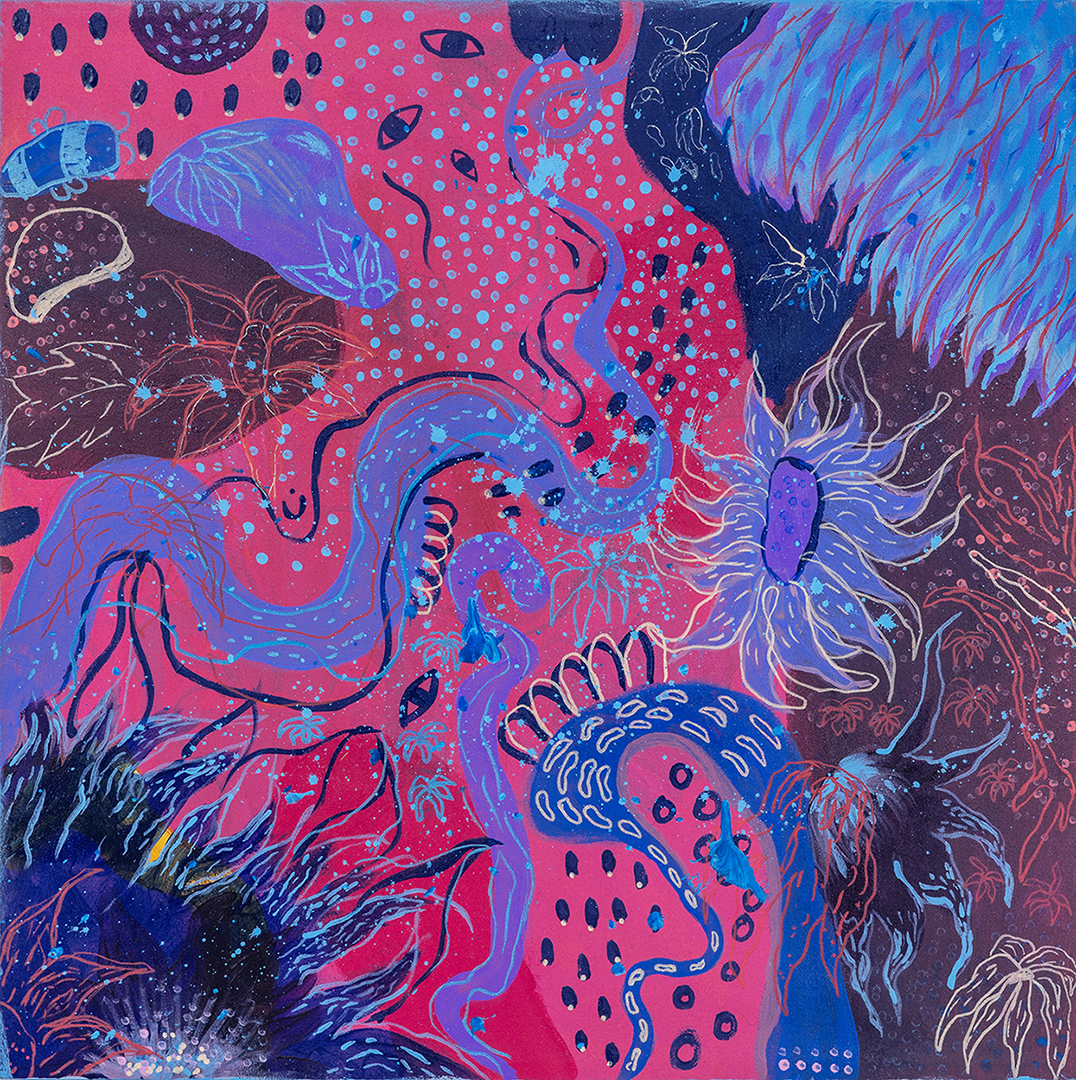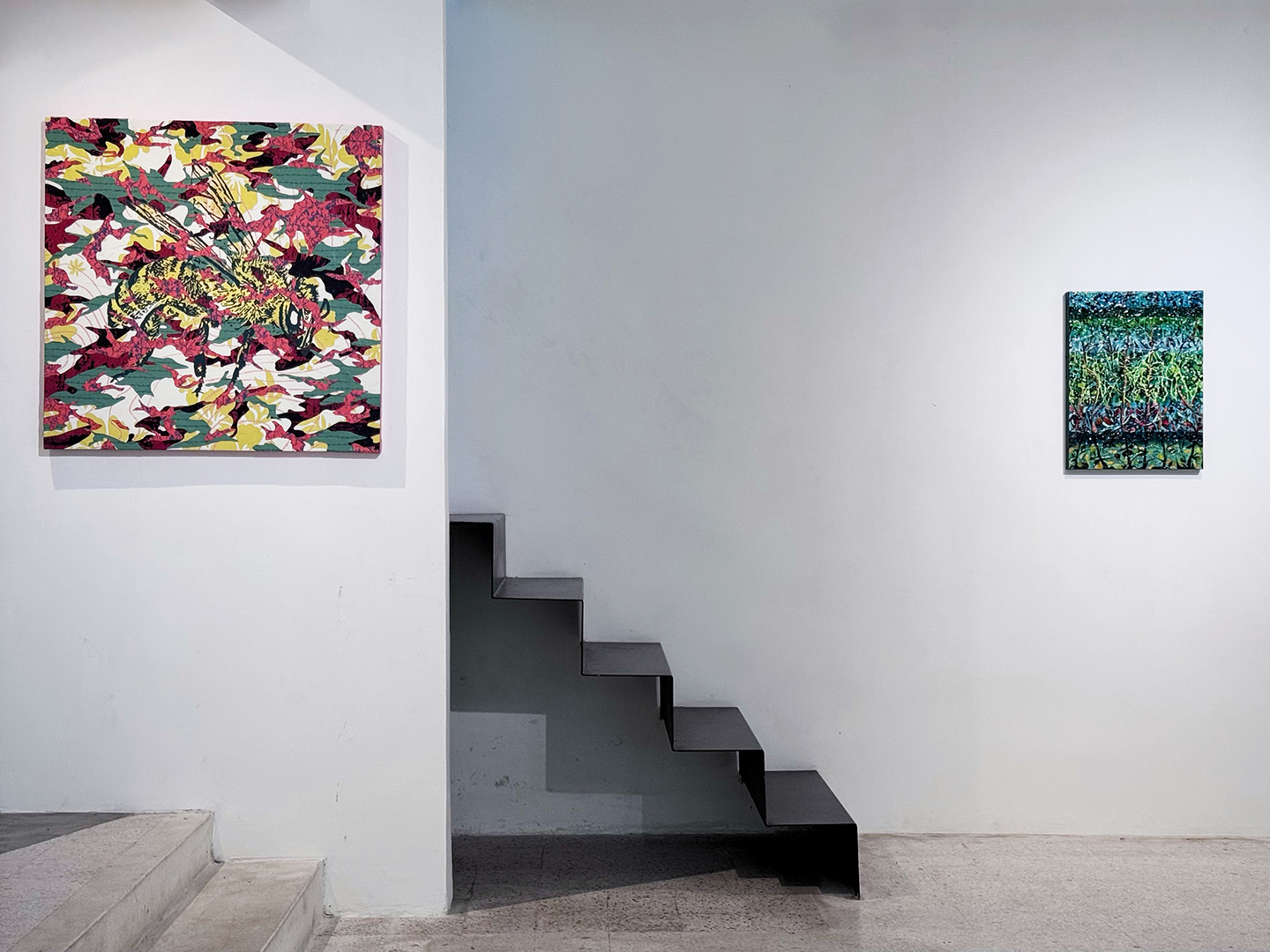 Amad’s artistic journey continues to evolve with explorations that intersect nature, society, and technology. His first solo, Echoes of Resilience, confronted themes of diversity, beauty standards, and social media’s grip on identity, exposing the tensions of contemporary life. In his latest works, Rhizome, inspired by aquascaping, as he examines the balance of structure and chance, where organic forms meet post-digital hues. These disruptions become metaphors for fragile systems—natural, social, and political—framing life as a complex interplay between the artificial and the organic, the beauty and the conflicted.