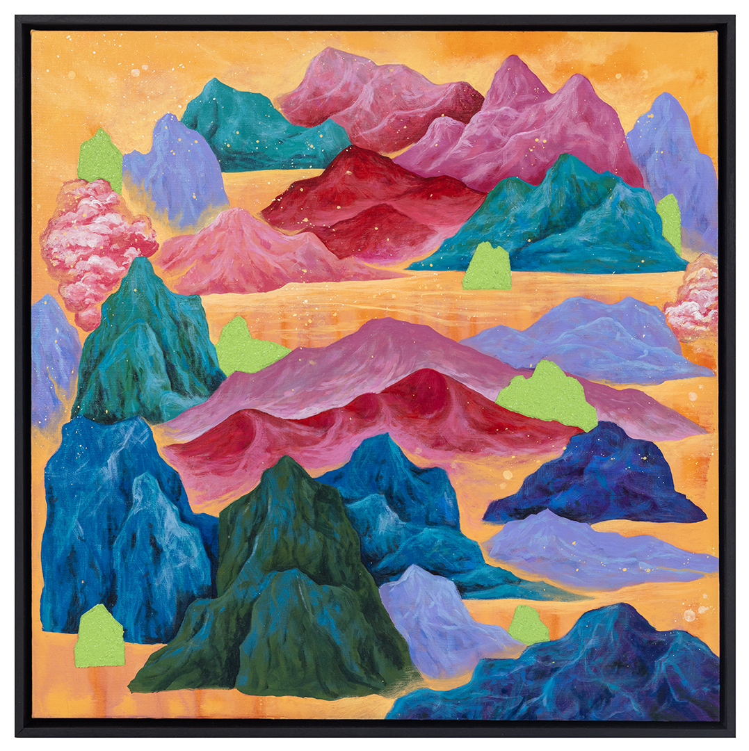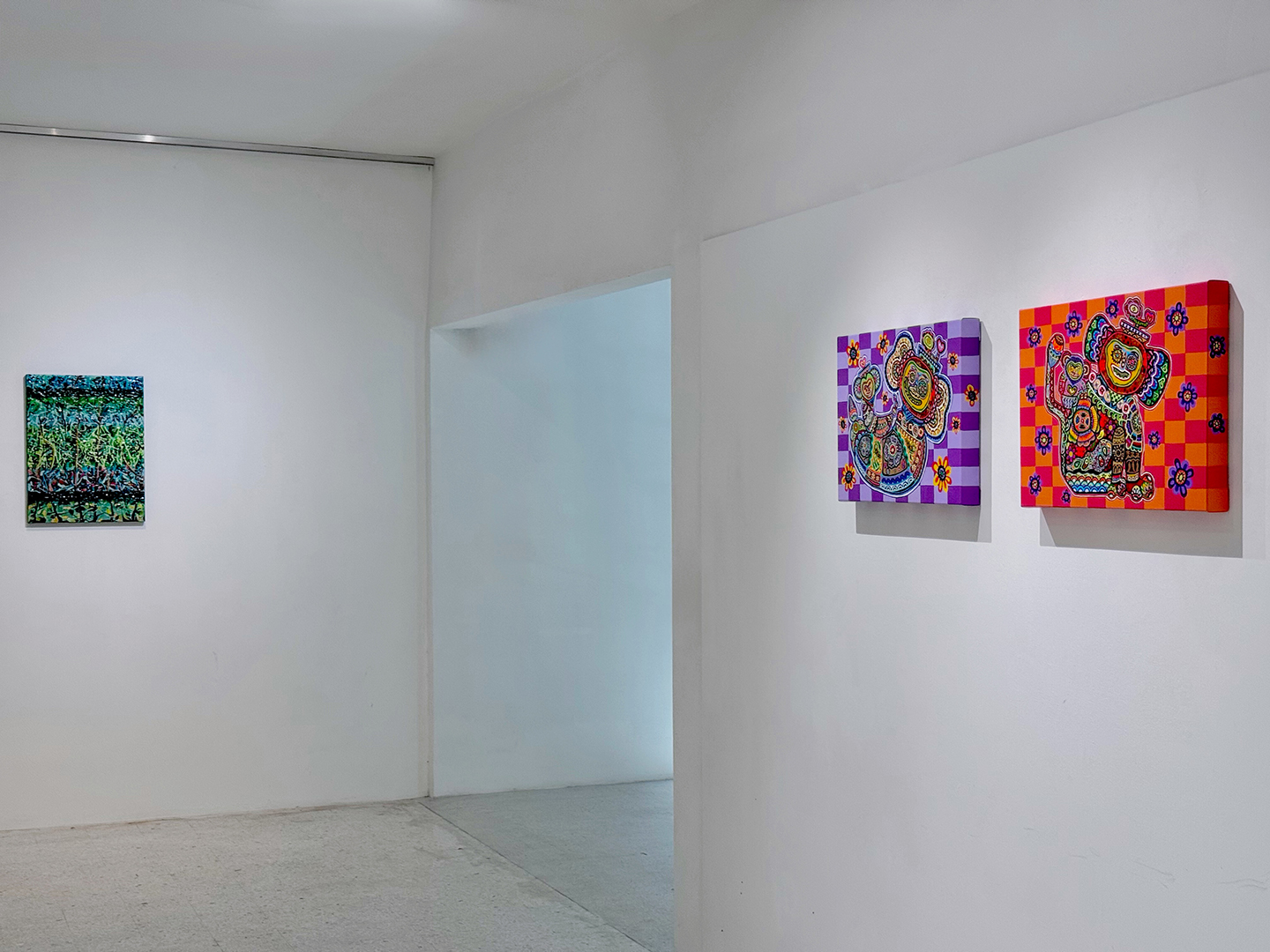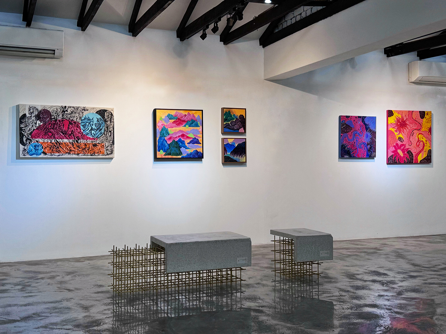 Zharfan’s latest body of work examines the evolving relationship between colour, technology, and identity in the Post-Digital age. His practice is rooted in questioning how digital screens have reshaped human perception, particularly through hyper-saturated RGB palettes and artificial filters that dominate contemporary visual culture. By appropriating shocking pinks, electric yellows, deep purples, and intense reds from screen-based media and transforming them through painterly gestures, textured layering, and material experimentation, Zharfan reclaims these digital colours within the tactile language of painting. This approach allows his works to negotiate between the synthetic and the sensory, reconnecting the artificial glow of technology with the human hand.