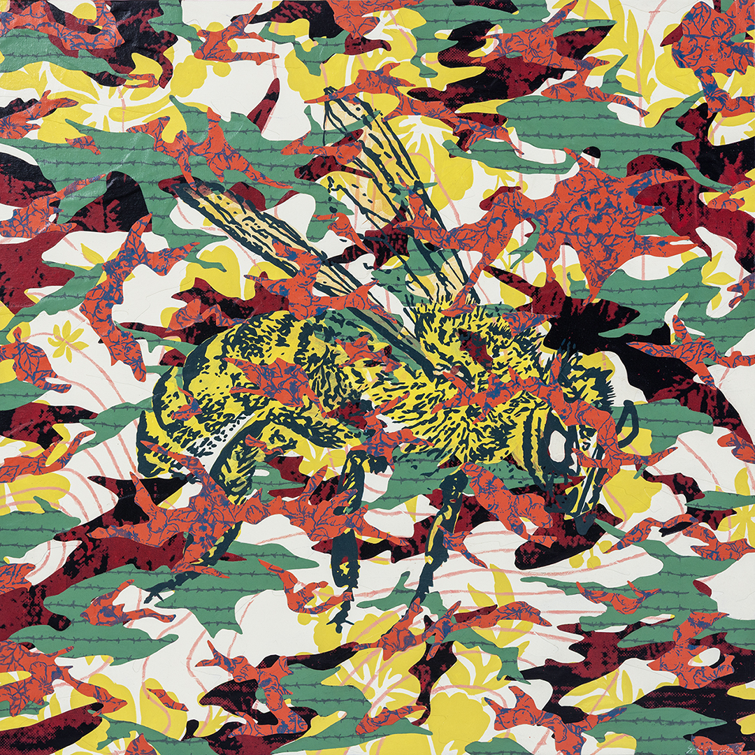 His work “An Attemptness to Taste the Sweetness” reflects this experimental language. At its center is the bee, a symbol of tireless labor, community, and the creation of sweetness. Set against overlapping patterns that echo both camouflage and natural forms, the bee emerges and dissolves within turbulent layers, embodying the fragile yet persistent human desire to grasp beauty amidst chaos. The work speaks to resilience and perseverance, suggesting that the pursuit of joy and sustenance often requires navigating complexity and uncertainty before arriving at moments of clarity and sweetness.