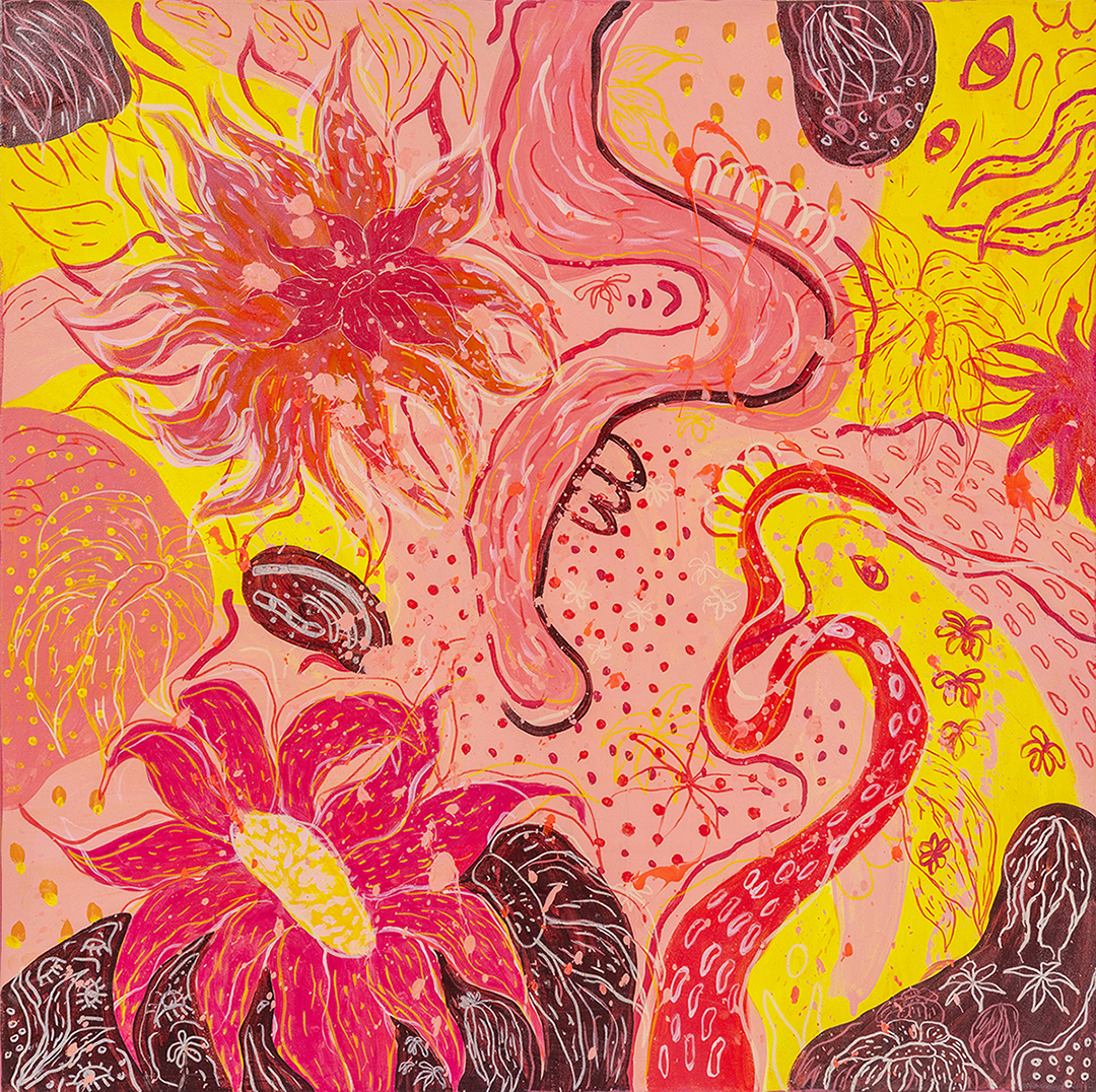 At the core of his compositions are surreal flora—stylised, fantastical flowers that twist, morph, and explode with raw energy. Far from decorative motifs, these blooms function as metaphors for modern femininity: complex, imperfect, and unapologetically alive. Their unruly forms resist traditional ideals of beauty, instead embracing chaos, resilience, and transformation. By staging a dialogue between the digital and the organic, Zharfan challenges viewers to reflect on their own digital conditioning while rediscovering colour’s physical and emotional resonance. His works ultimately celebrate imperfection, strength, and authenticity, offering a feminist and humanistic lens within a world increasingly mediated by algorithms.