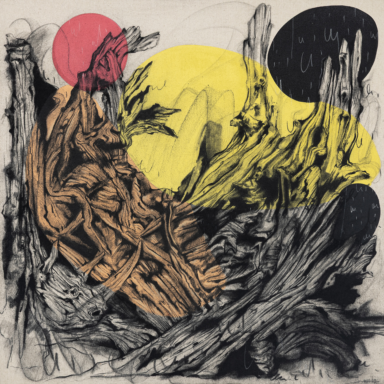 Amad’s artistic journey continues to evolve with explorations that intersect nature, society, and technology. His first solo, Echoes of Resilience, confronted themes of diversity, beauty standards, and social media’s grip on identity, exposing the tensions of contemporary life. In his latest works, “Staring Woods” draws inspiration from fallen trees and tangled roots—symbols of endurance, memory, and quiet transformation. The work reflects on what remains after change, blending rough textures and faded forms with vibrant, digitally infused hues to evoke renewal beneath decay. It captures the beauty in remnants and the persistence of life, suggesting that even in stillness, nature and the digital world remind us that change is a continuous, living force.