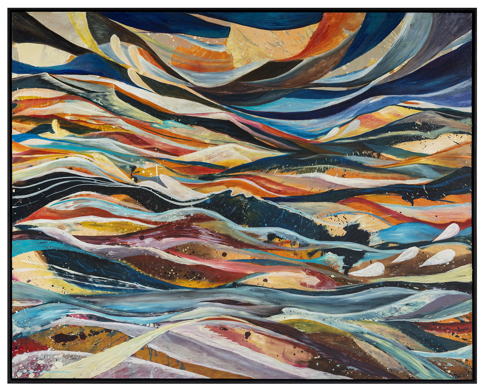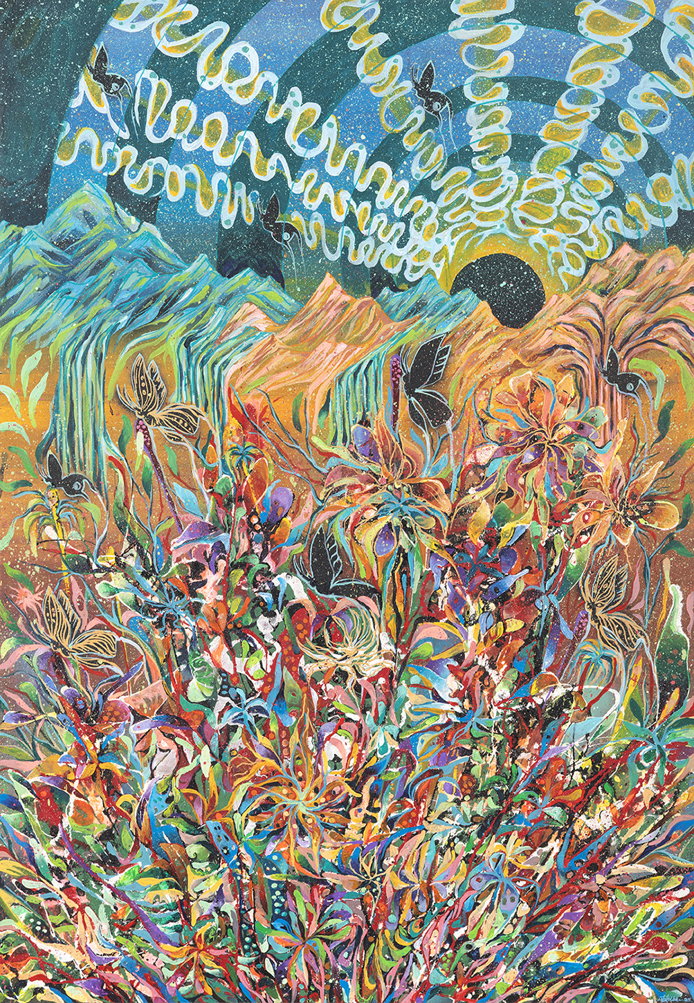 In “Rise into Freedom,” Faez explores the awakening of the human spirit and the desire to break free from limitations that confine personal potential. Bright colors emerging from dark tones symbolize hope amid adversity, while blooming flowers and butterflies evoke resilience, transformation, and liberation. The steadfast mountains and expansive sky reflect strength and aspiration. Through this work, Faez conveys a call to rise, embrace freedom, and express the soul with authenticity and hope.