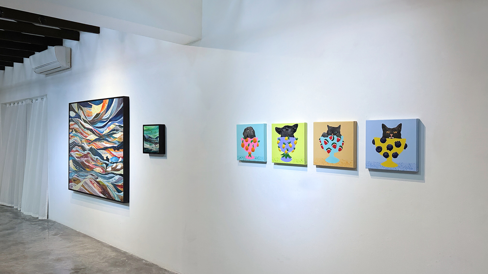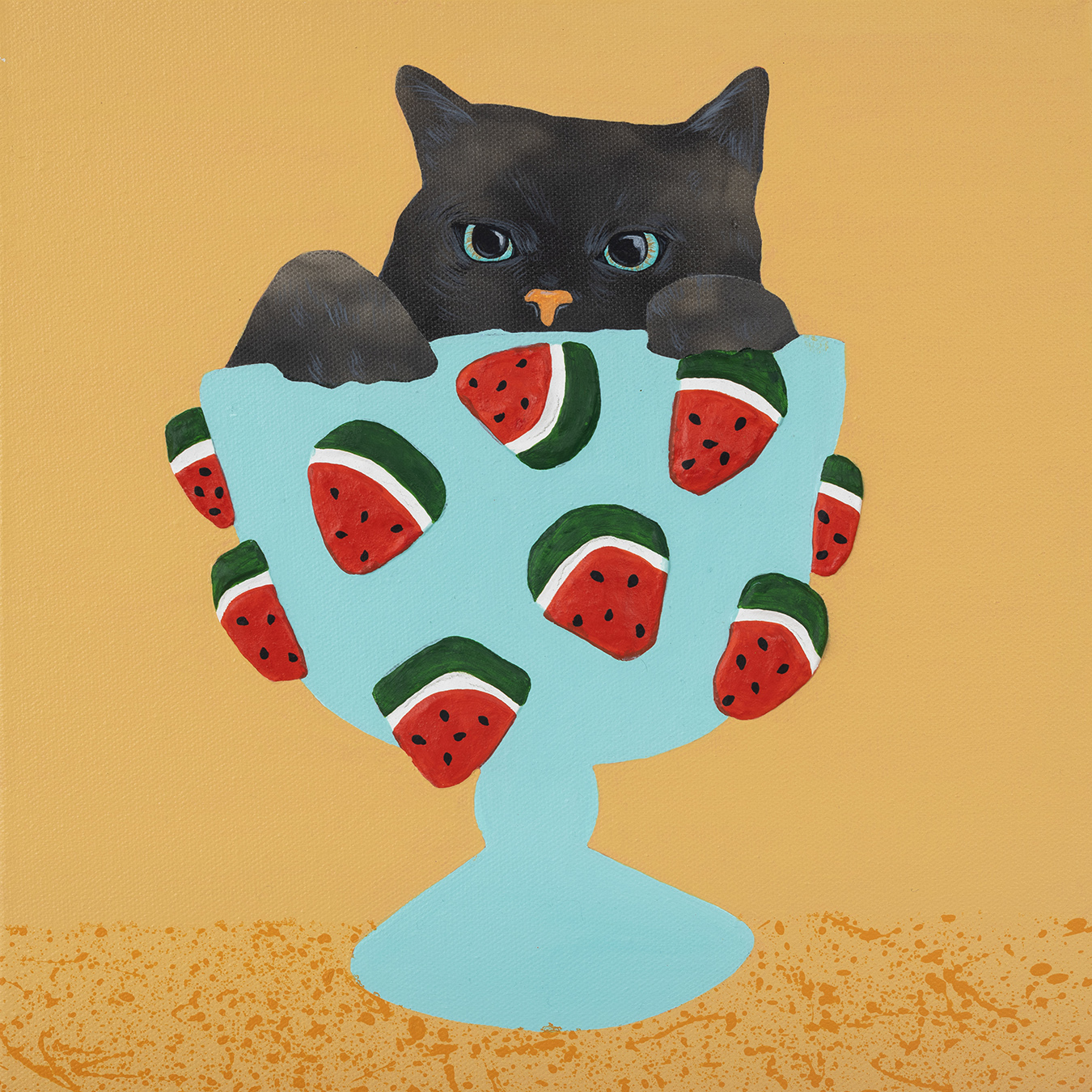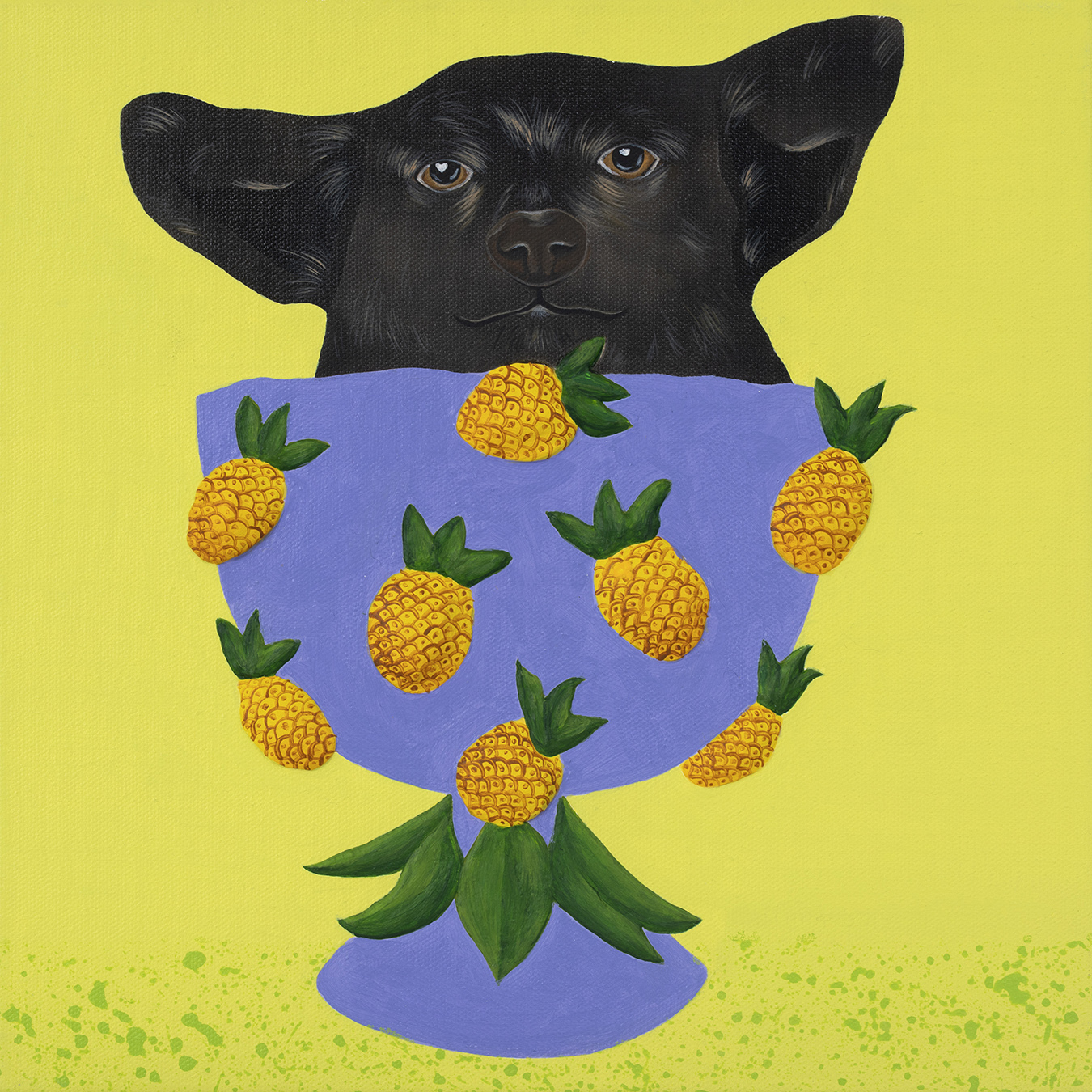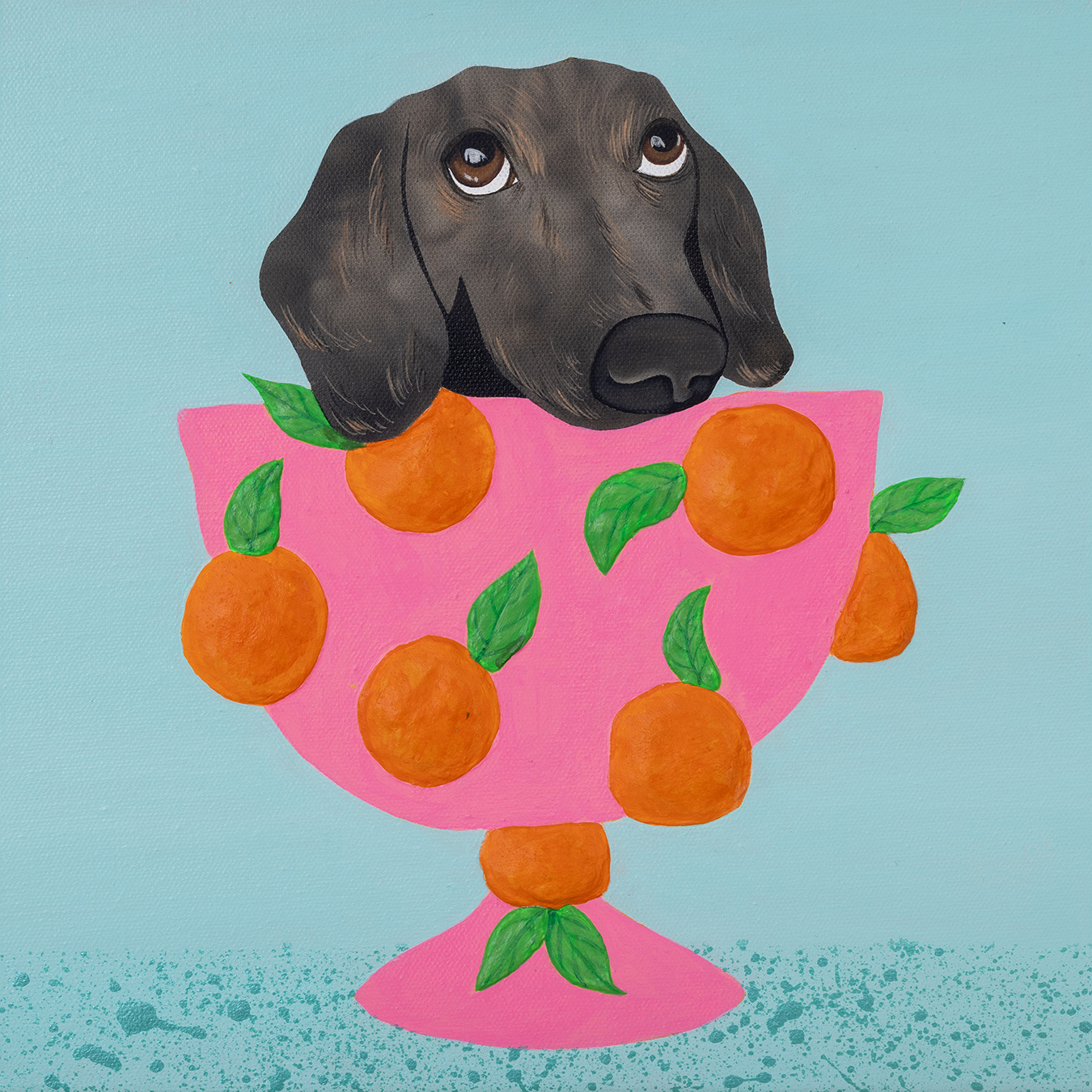 In Mr. Fruity, Fana captures the pure joy of an unlikely gathering of cats and dogs nestled within a vibrant fruit bowl. Inspired by the simple happiness pets bring and the harmony found in contrasting personalities, the work transforms a traditional still life into a playful scene of abundance and energy. Through this whimsical composition, Fana invites viewers to reflect on the beauty of diversity, the sweetness of everyday moments, and the joy shared with beloved companions.