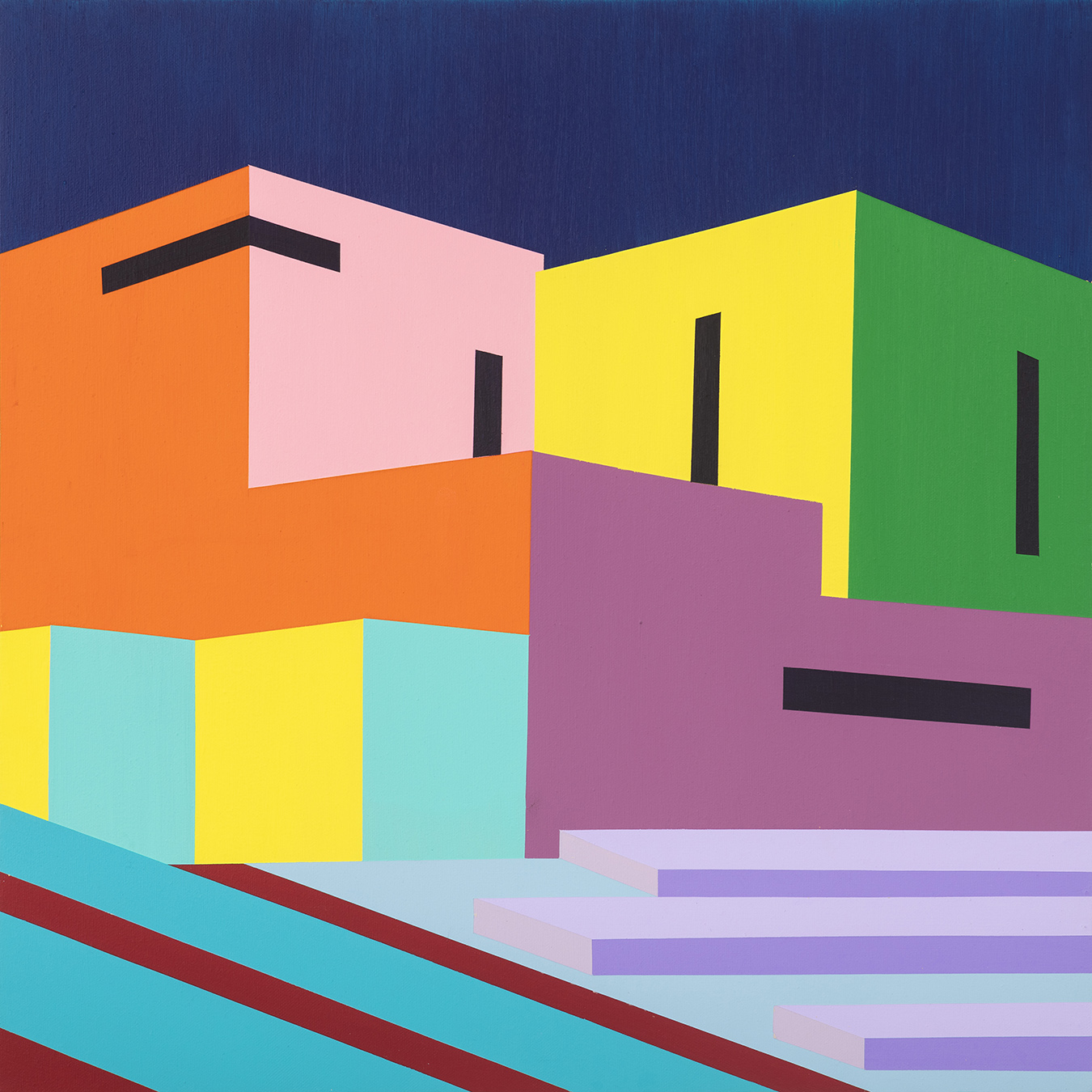 City in Technicolour II reimagines the urban landscape as a vibrant, living entity where architecture transcends muted rigidity to pulse with bold, tropical colours. Geometric forms and palm trees converge in playful chaos, reflecting a city infused with warmth, rhythm, and imagination. This work challenges conventional perceptions of urban spaces, suggesting that cities are not merely built from concrete and steel, but also from the dreams, emotions, and vibrant energies of those who inhabit them.