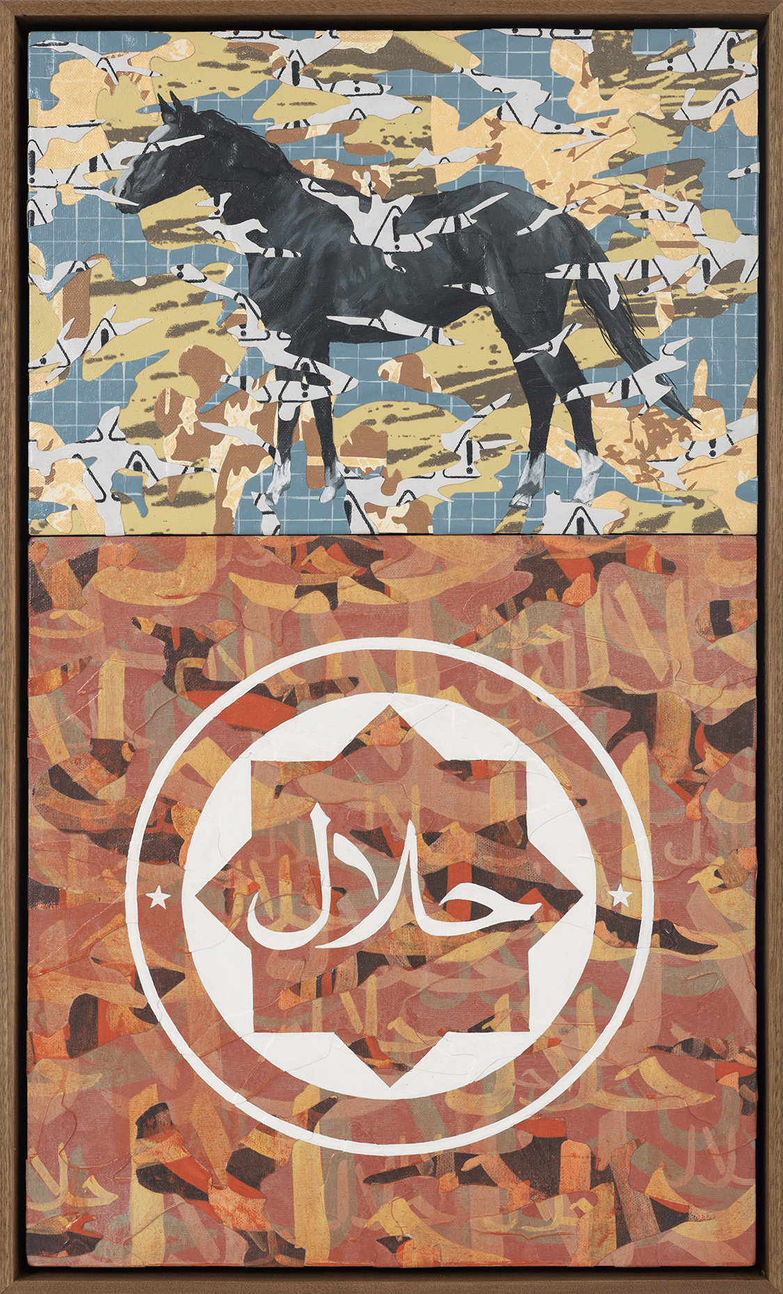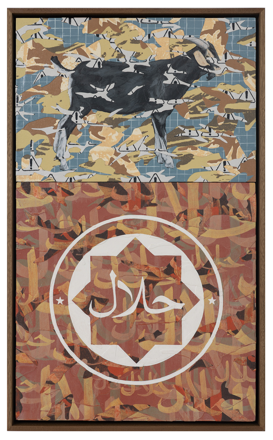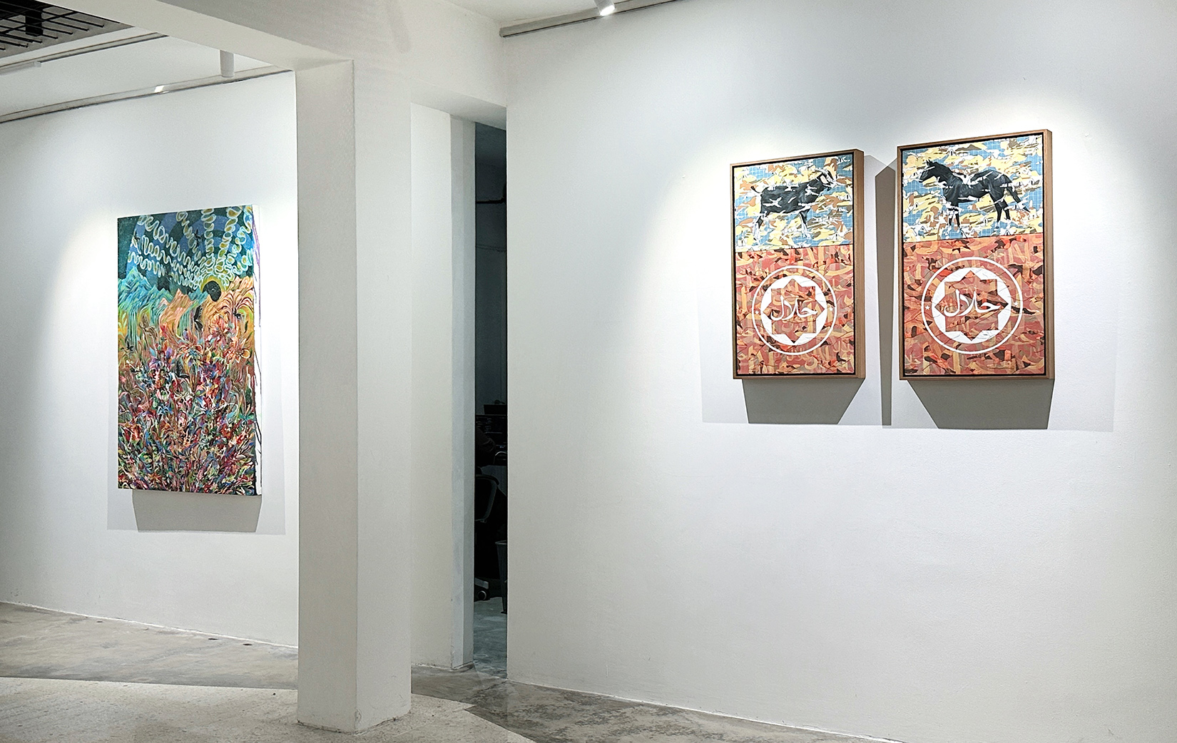 In his work, reinterprets the Malay idioms “kambing hitam” (black goat) and “kuda hitam” (black horse) to explore themes of manipulation, power, and irony. The black goat represents those exploited or scapegoated by others, while the black horse symbolizes the unexpected emergence of the overlooked. Through a sarcastic lens, Syahmi incorporates a Halal logo to comment on how moral justification is often used to legitimize questionable actions, inviting reflection on ethics and societal hypocrisy.