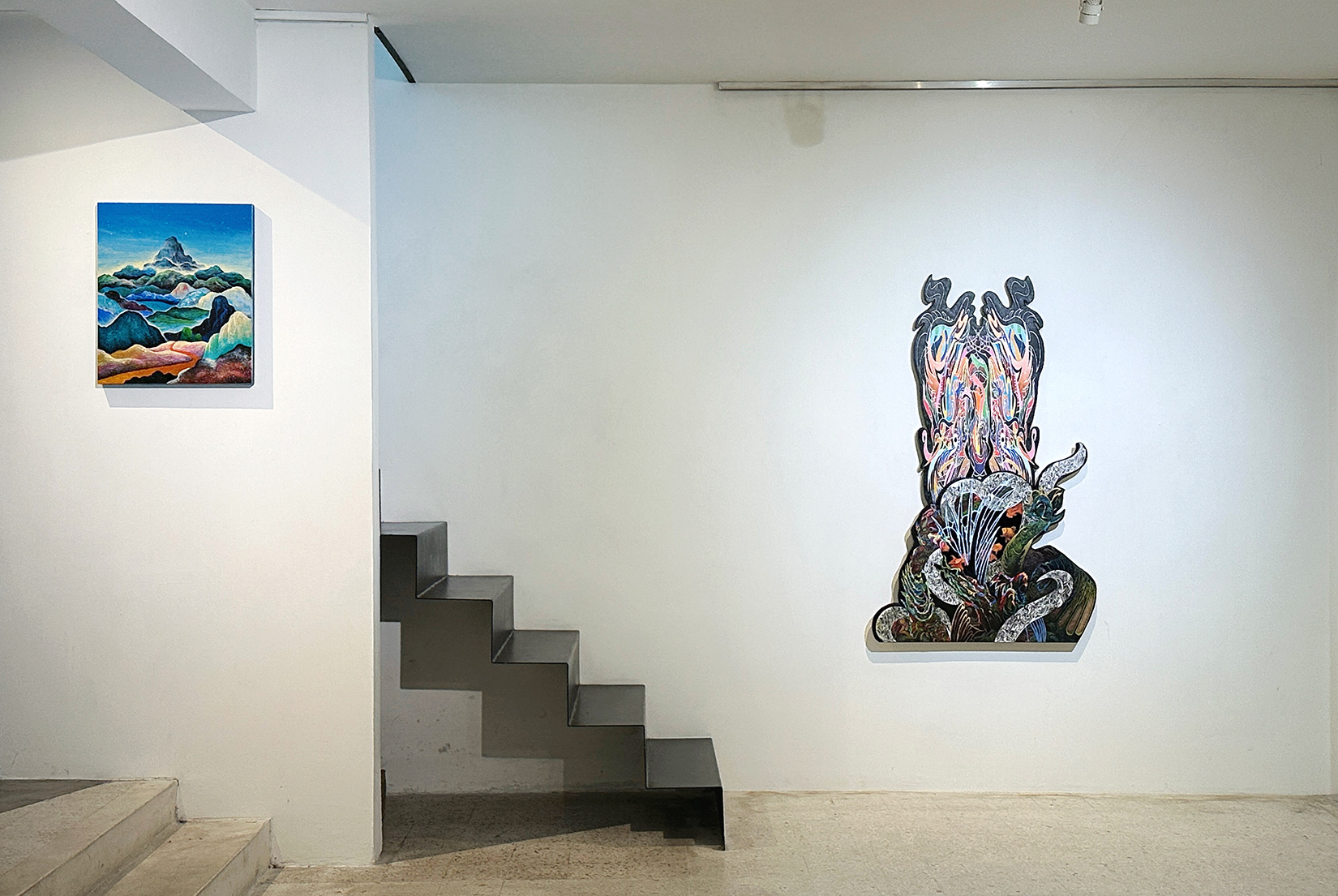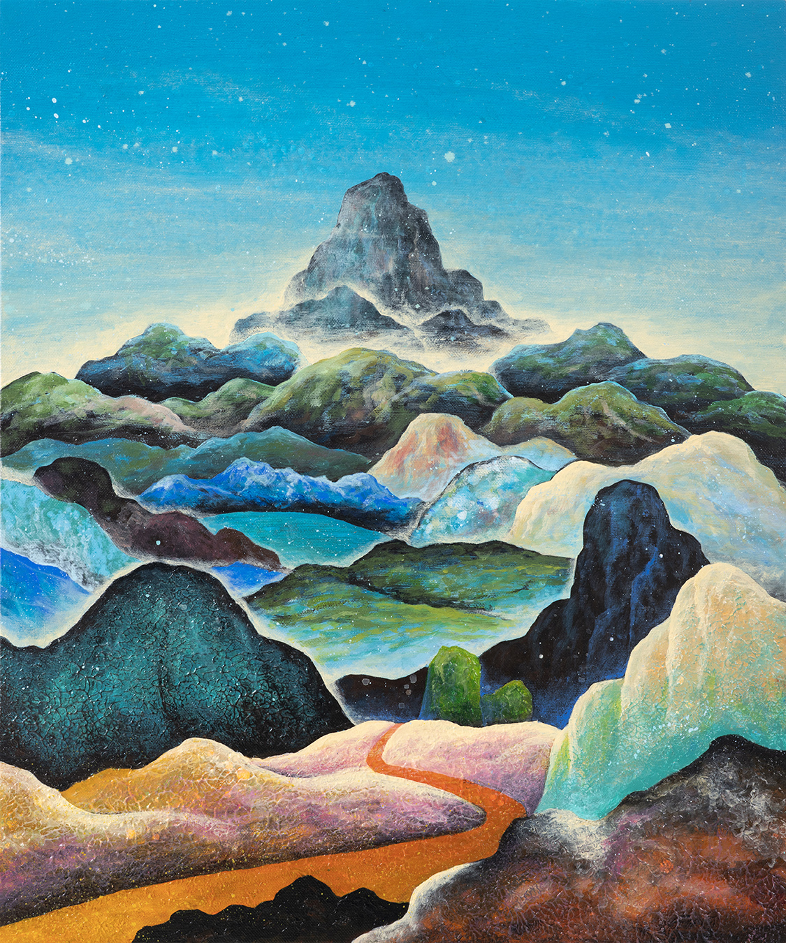 In this series, Fadzril explores landscapes through layered forms of land, volcanoes, rivers, mountains, and clouds—elements that bring structural depth to each composition. Rather than depicting nature realistically, his works stand as independent expressions of mood and form. Soft pastel tones evoke sweetness and nostalgia, reflecting his memories and personal interpretations of the natural world.
