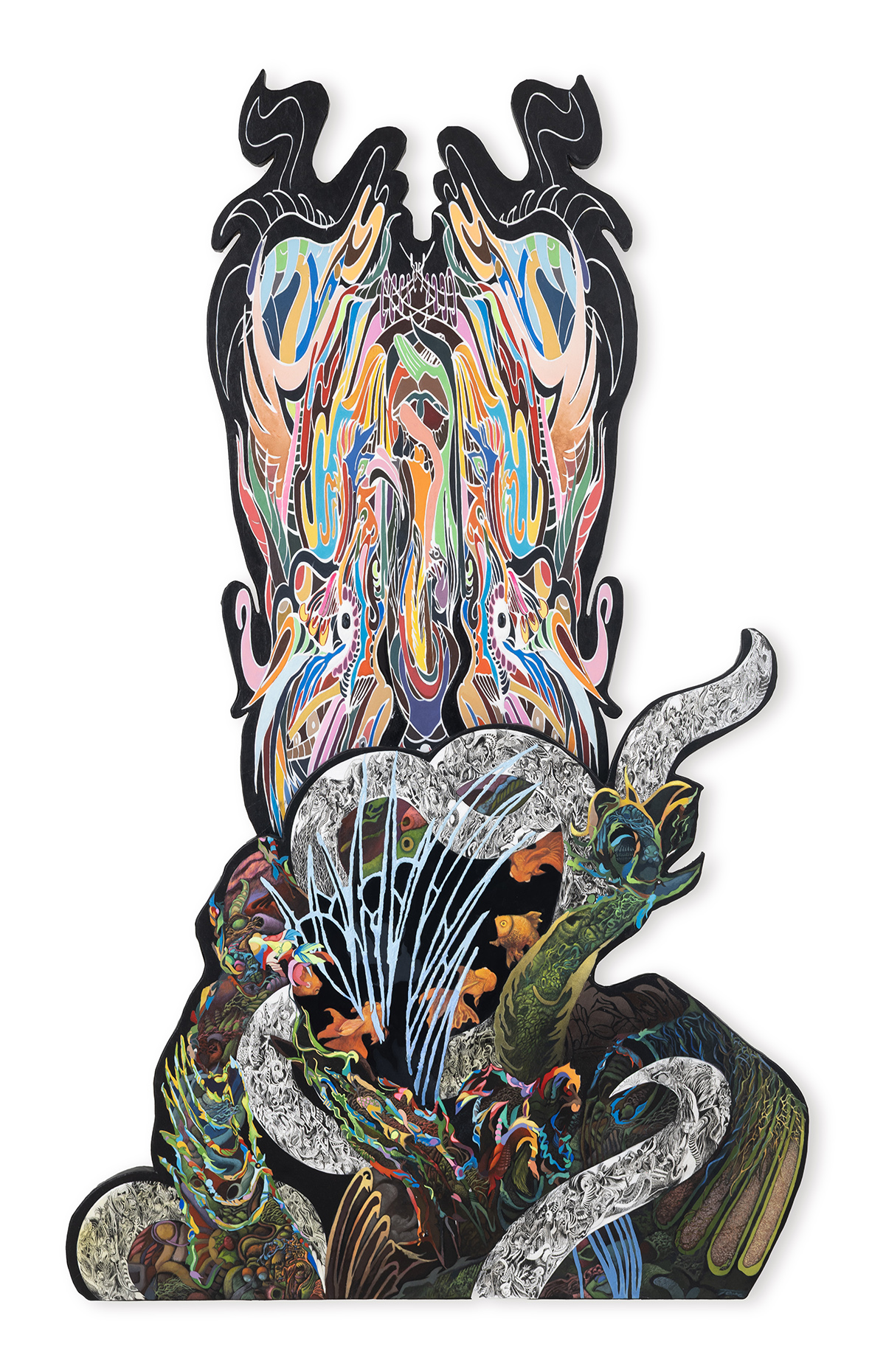 In her latest series, Tong explores the emotional and cultural layers of Malaysia’s multi-ethnic identity. Through abstraction, symbolic motifs, and a restrained composition, she reflects on how individuals and communities coexist while preserving their distinct voices. In this work, Tong’s language of layered cut-outs and fluid strokes reveals the interplay between chaos and beauty. Beneath the surface, silent patterns and shadows carry traces of history and memory. From this depth, a lone bird ascends as golden fish gather in dialogue—a metaphor for transformation and harmony. For Tong, this rise is more than ascent; it is a passage toward clarity, renewal, and peace…
