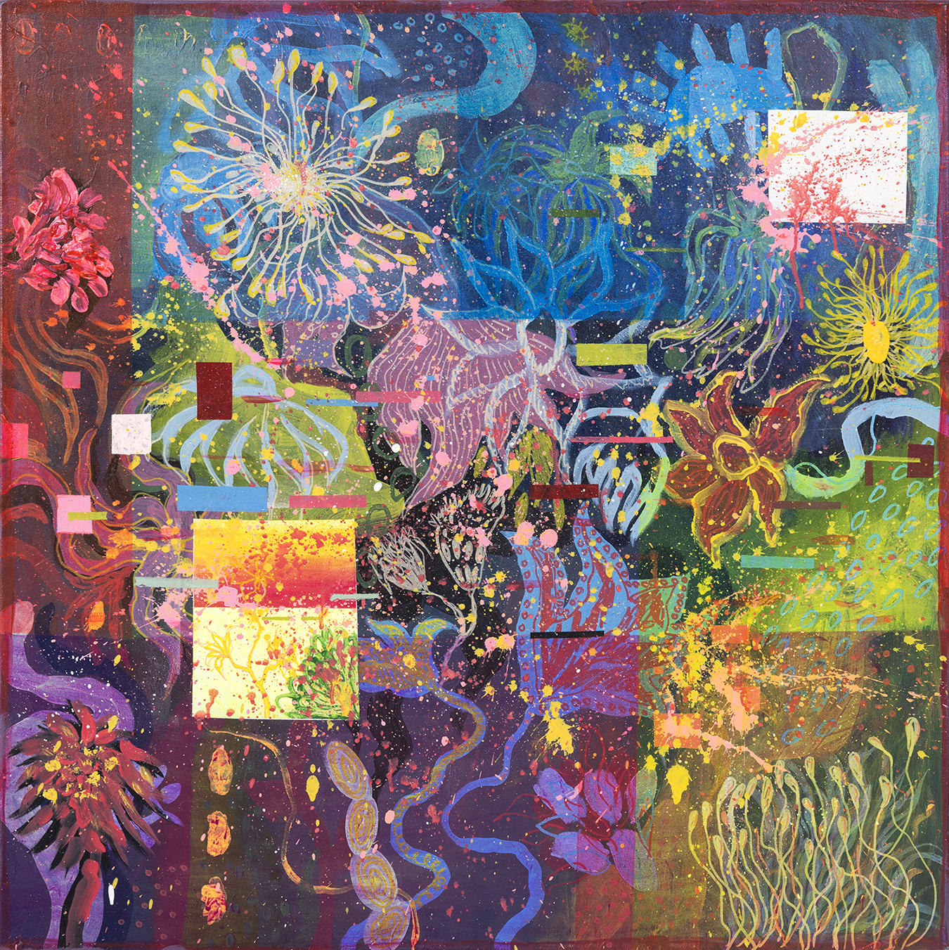 Zharfan’s latest body of work investigates the evolving relationship between color, technology, and identity in the post-digital age. Rooted in questioning how digital screens reshape human perception, his practice transforms hyper-saturated RGB tones—shocking pinks, electric yellows, deep purples, and intense reds—into tactile, painterly expressions. Through textured layering and material experimentation, Zharfan reclaims digital color within the physical language of painting, bridging the synthetic and the sensory to reconnect technology’s artificial glow with human emotion and touch.