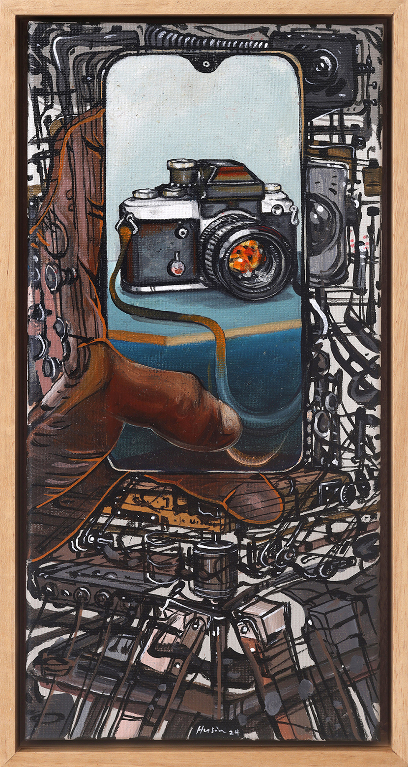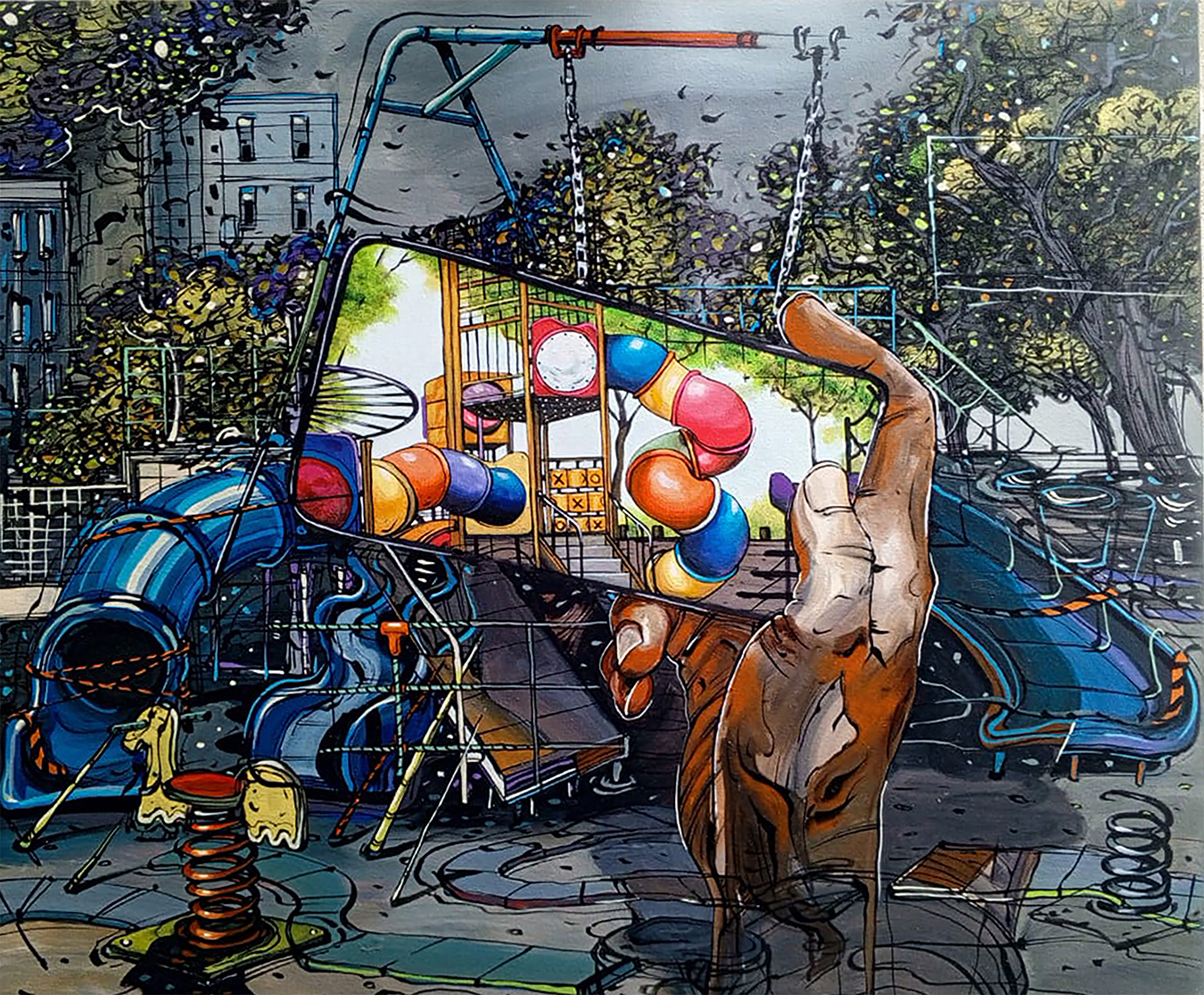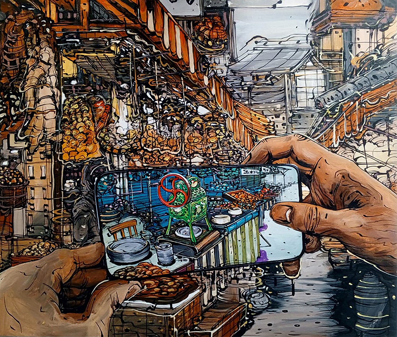 這件作品彷彿是一幅記憶的框架,捕捉了藝術家生命中曾經存在的一個場域。它呈現出過往仍在記憶中呼吸的片段——每個街角、每條斑駁的巷弄、每處曾充滿聲音與故事的空間。即便現實中的場所隨著時間逐漸褪色,作品卻以兩種對比的維度將其重現:一為逐漸衰敗的現實,另一則是經過理想化記憶重構的數位幻景。此作激起一種懷舊情感,也許是對童年片段或過往未曾察覺的美感的追憶,如今透過科技的視角重新詮釋。作品揭示了現代生活的諷刺:一方小小的螢幕能夠改變觀看的角度,掩飾瑕疵,塑造一種從未真正存在的美好。畫面中,一邊是灰暗、雜亂的現實世界——擁擠的市集、靜默斑駁的街道、在時光中破敗的遊樂場,以壓抑的色彩與銳利的線條呈現;而在螢幕內,一切卻顯得繽紛、有序與理想化,隱喻著數位美學如何遮蔽現實,並重塑我們記憶中的過去。