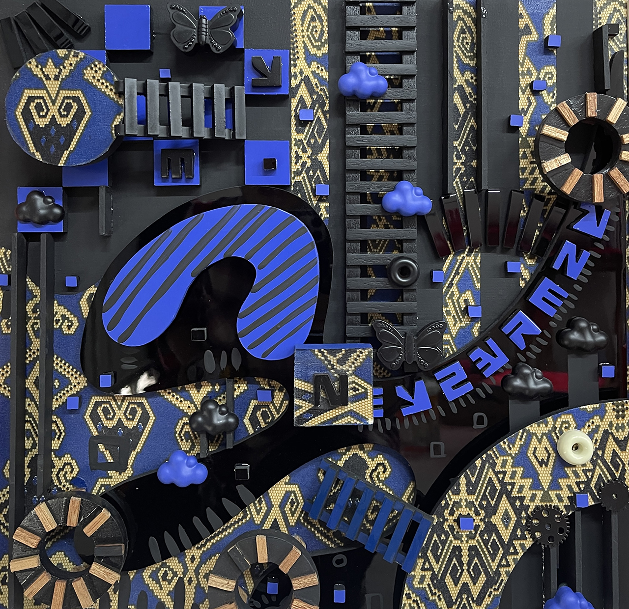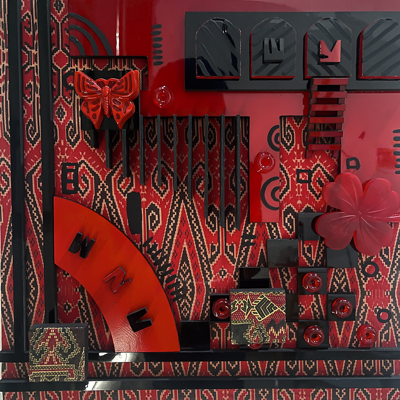 “Fragments XS” is a vibrant exploration of cultural identity, tradition, and the tensions between modernization and heritage. Using mixed materials such as hardwood, resin, and fabric, the artist weaves together intricate patterns and dynamic compositions to celebrate the richness of Indigenous and Southeast Asian design, while reimagining it through a contemporary lens. The juxtaposition of organic elements—like flowers and butterflies—with industrial motifs such as gears and cogs underscores the delicate balance between nature and the forces of industrialization, reflecting on the evolving dialogue between past and present. The title “Fragments XS” evokes the act of assembling disparate pieces into a cohesive whole, symbolizing the layered interconnections of Sarawakian culture, heritage, and personal history. Through its meticulous construction, the artwork invites viewers to engage with the complexities of cultural narrative and consider the ongoing interplay between tradition and progress.